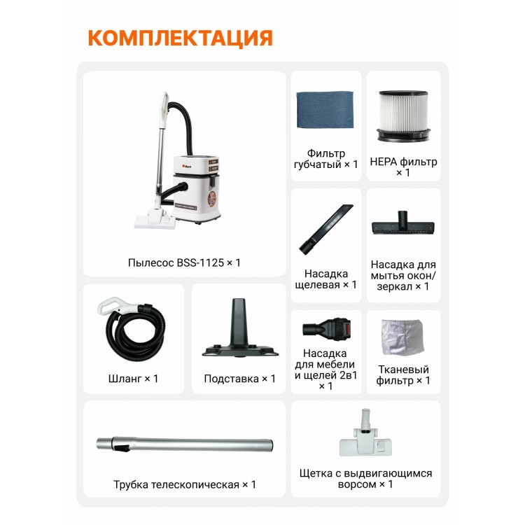 | Название | Пылесос для дома BORT BSS-1125, 400 Вт, патронный HEPA фильтр, 18 л, шланг 2 м, сбор жидкости, выдув |