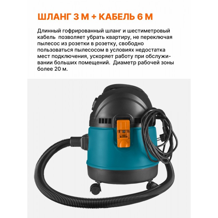 * Объём бака/пылесборника — 20 литров: можно не беспокоиться о частой очистке.