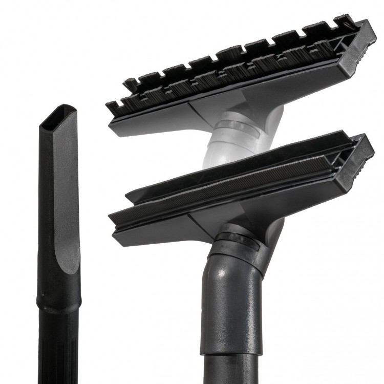 Шланг на вид и по ощущениям тонкий пластик, может и и не породавится если встать на него случайно, но вероятность повреждения большая.  На ручке нет отверстия с задвижкой, для регулировки потока воздуха, не хватает маленькой щётки в комплекте, на мой взгляд. Легко моется, уборка воды на ура!