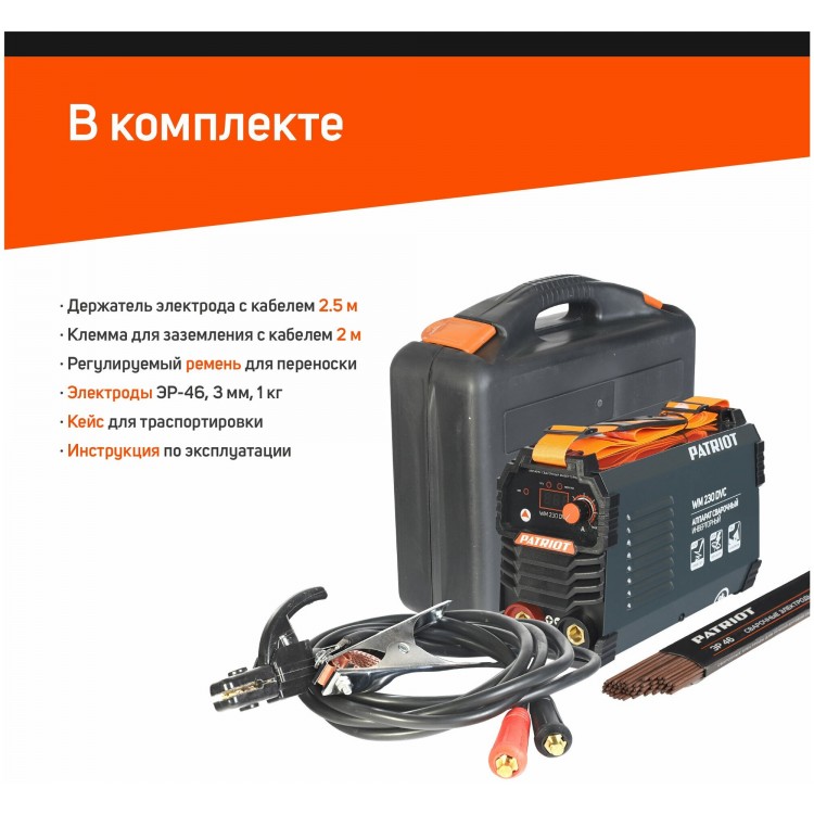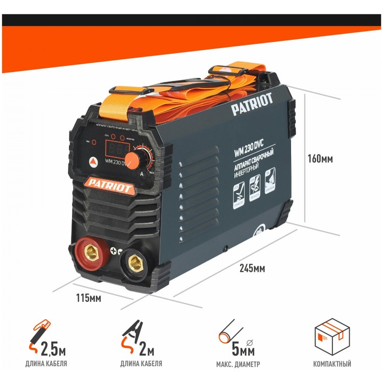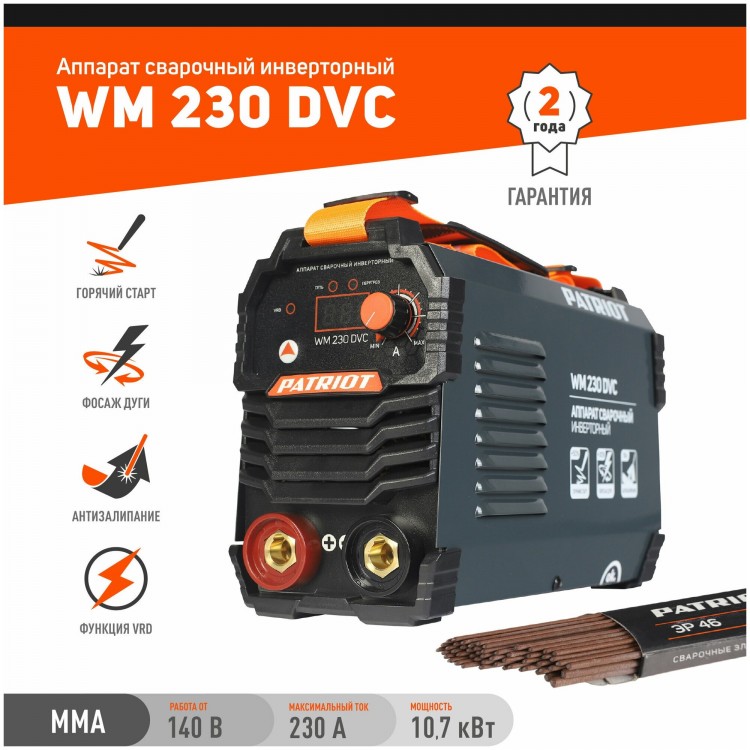 Преимущества сварочного аппарата Patriot WM230DVC:* Широкий диапазон сварочного тока: 20–230 А;