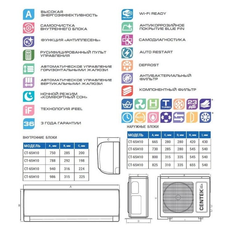 Название Сплит-система Centek CT-65H18 Черный/зеркало; Бренд CENTEK; Цвет товара черный; Тип кондиционера сплит-система; Тип внутреннего блока настенный; Площадь помещения 54 м²; Мощность кондиционера 18 BTU; Инверторный нет; Класс энергопотребления A; Подача питания внутренний блок; Wi-Fi да; Особенности дисплей, зимний комплект, индикация работы, пульт ДУ, регулировка направления воздушного потока, таймер включения/выключения, управление со смартфона, Автоочистка, Диагностика неисправностей, Ионизация воздуха, Климат-контроль, Очищение и увлажнение воздуха, Скрытый дисплей; Режимы обогрев, охлаждение, Осушение; Мощность в режиме охлаждения 5600 Вт; Потребляемая мощность при охлаждении 1490 Вт; Потребляемая мощность при обогреве 1460 Вт; Дополнительные режимы авто, вентиляция, ночной, осушение, турбо, Режим увлажнения; Дополнительные функции Follow me, автоперезапуск, самоочистка внутреннего блока, автоматическое поддержание температуры; Уникальные технологии 3D Auto Air, Blue Fin, I Feel, I clean; Уровень шума внутреннего блока (мин/макс) 28 дБ / 49 дБ; Предварительный фильтр есть; Фильтр тонкой очистки воздуха есть; Тип фильтра антибактериальный, фотокаталитический, Воздушный фильтр; Хладагент R 410A; Диапазон поддерживаемых температур 16 - 49°С; Охлаждающая способность 18000 BTU/ч; Подробная комплектация Внешний блок, внутренний блок, пульт ДУ, руководство по эксплуатации; Работает в системе "умный дом" да; Тип соединения устройств проводное; Размеры наружного блока сплит-системы или оконного кондиционера (ШxВxГ) 80x54.5x31.5 см; Размеры внутреннего блока сплит-системы или мобильного кондиционера (ШxВxГ) 94x31.6x22.4 см; Вес внутреннего блока 12 кг; Вес внешнего блока 38 кг; Габариты транспортной упаковки 39х98х97 см; Вес в транспортной упаковке 40 кг; Гарантийный срок 3 г; Цвет черный;