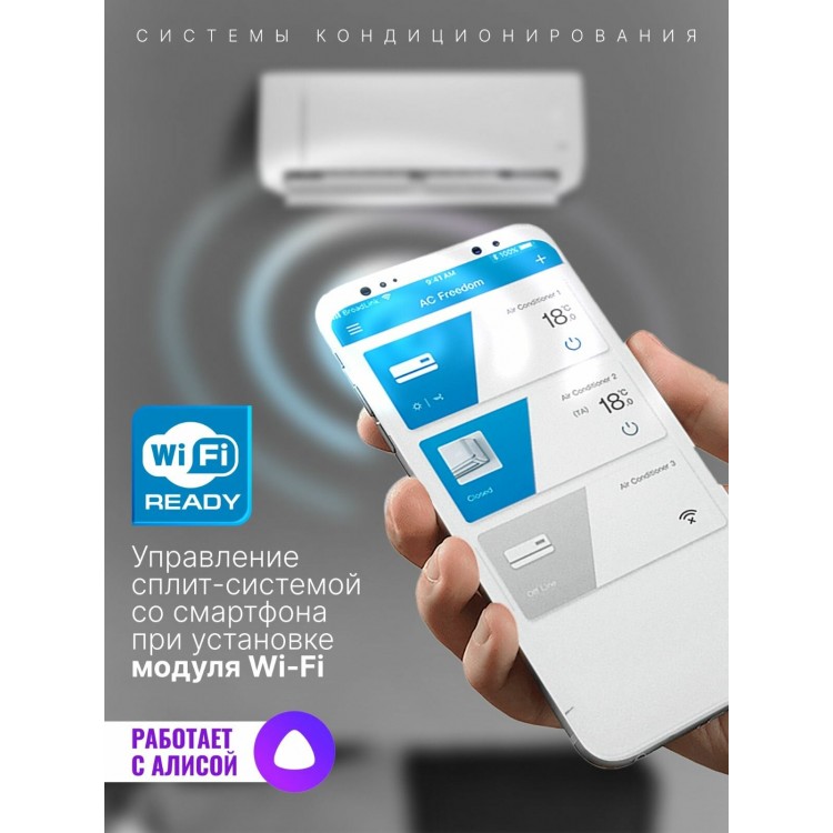 В комплектацию входят наружный и внутренний блоки, пульт дистанционного управления, руководство по эксплуатации и комплект монтажных креплений для внутреннего блока. Кондиционер совместим с экосистемой Умного дома Яндекс и управляется через голосового помощника Алису.