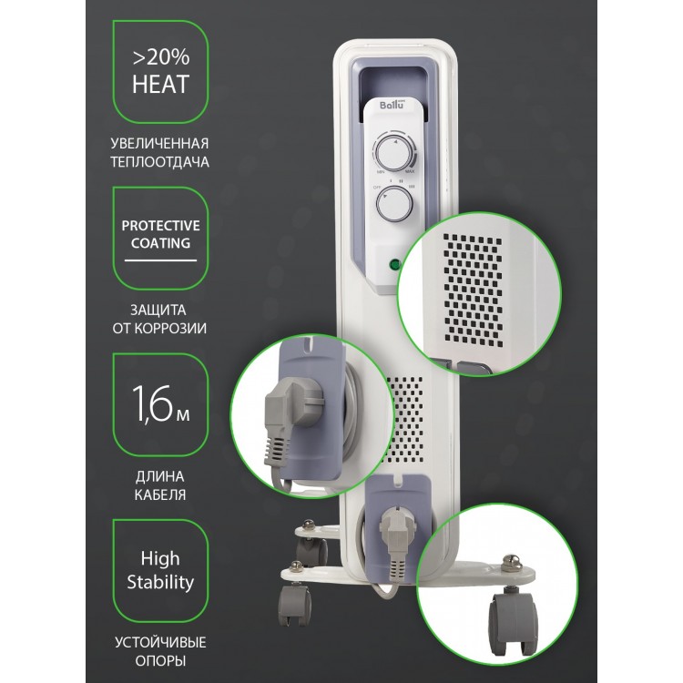 Радиатор на 9 секций, быстро прогревает комнату. Перемещаю без проблем, благодаря ручке и шасси. Мощность выставляю регулятором на корпусе.