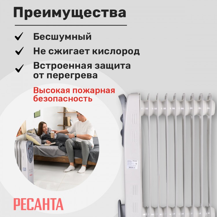 Масляный радиатор РЕСАНТА ОМ-9А также отличается выгодной ценой и низким энергопотреблением. Это делает его одним из самых экономичных и доступных вариантов на рынке.