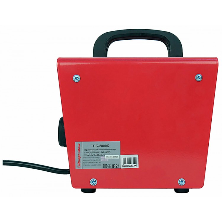 Название Тепловентилятор керамический ТПБ-2000К, 2кВт/1кВт, термостат, защита от перегрева; Бренд Энергомаш; Цвет товара Черный/красный; Площадь помещения 30 м²; Тип нагревательного элемента Керамический; Управление Механическое; Установка Настольная/напольная; Гарантийный срок 1 г; Вес 1.7 кг; Цвет черный/красный;
