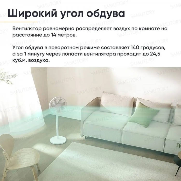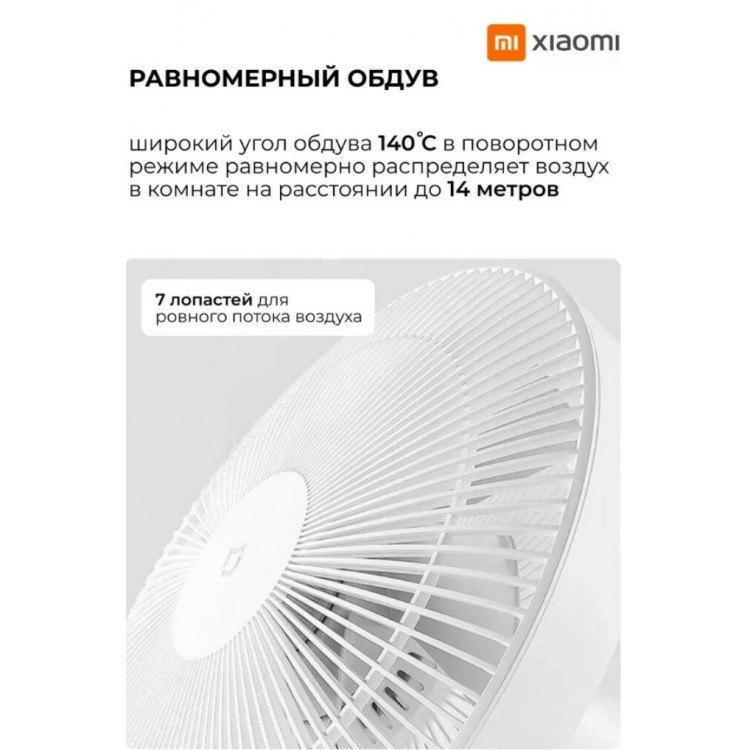 | Дополнительная информация | Семь лопастей создают мощный и равномерный поток; Поворот обдувающей части на 40° по вертикали; Удаленное управление через приложение Mi Home для выбора режима, настройки таймера и др.; Возможность включения в систему умного дома; Доступна 100-ступенчатая регулировки интенсивности подачи воздуха; Уровень шума – от 26 дБ до 52 дБ; |