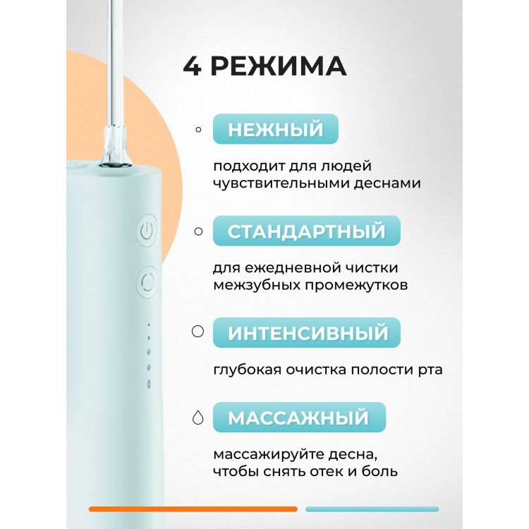 ирригатор отличный. работает без сбоёв. пользуюсь уже около полугода. зарядки хватает надолго. есть несколько режимов. выбрала один для себя наиболее подходящий. внешний вид достойный, на ощупь очень приятный, хороший качественный пластик
