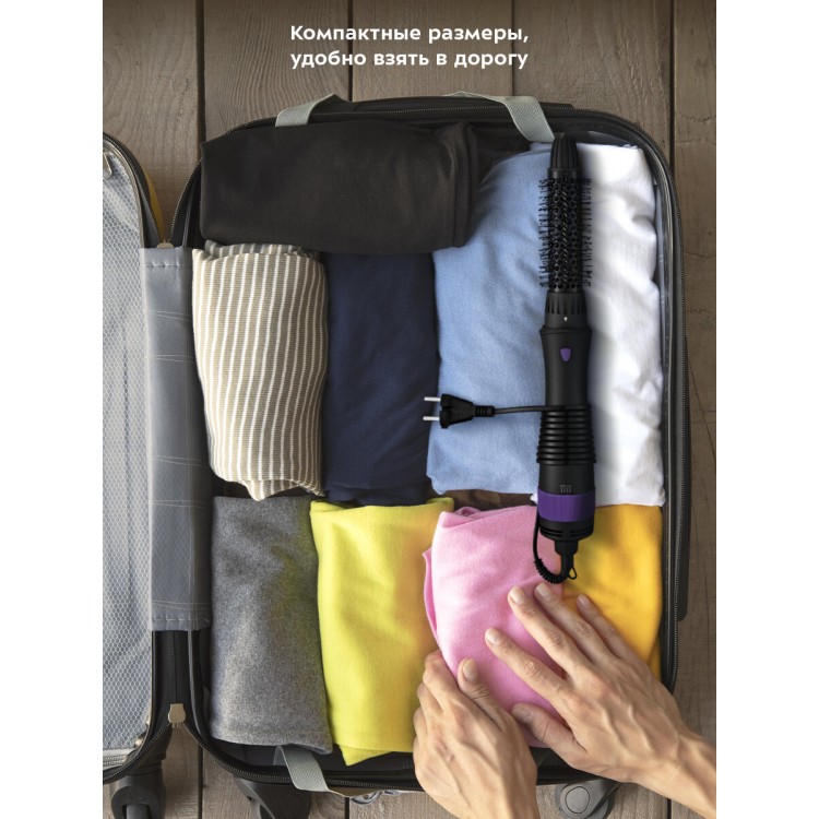 Быстро сушит и укладывает волосы, удобный в использовании, занимает мало места. Эргономичная форма.