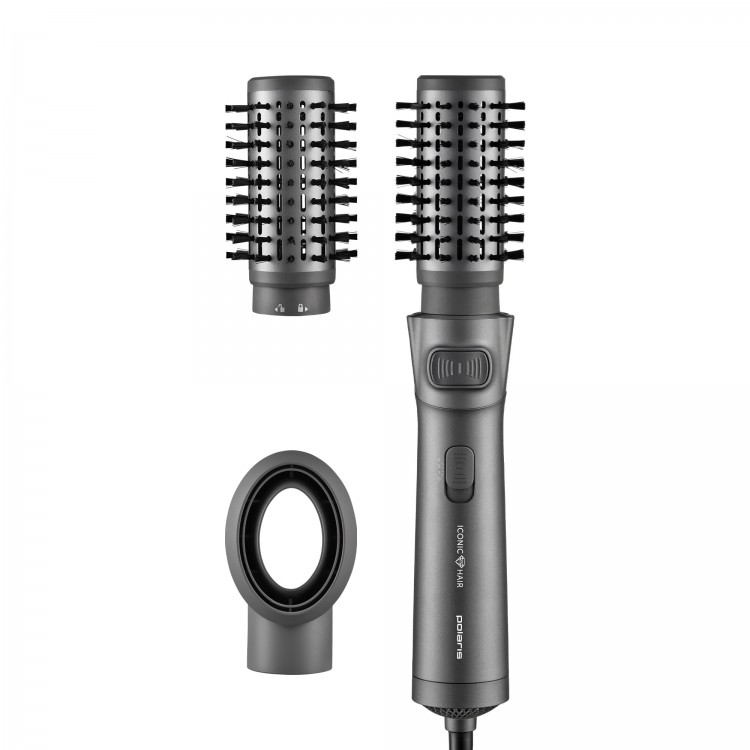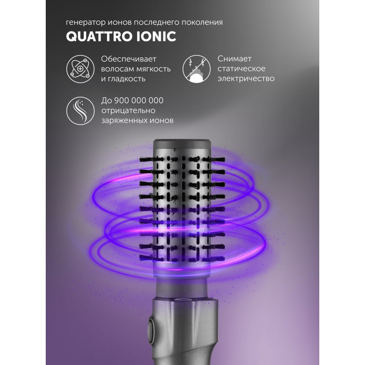 Стильный, мощный, два брашинга в комплекте. Есть ионизация, защита от перегрева. Быстро укладывает, не путает волосы, можно легко делать объем у корней и завивать концы.