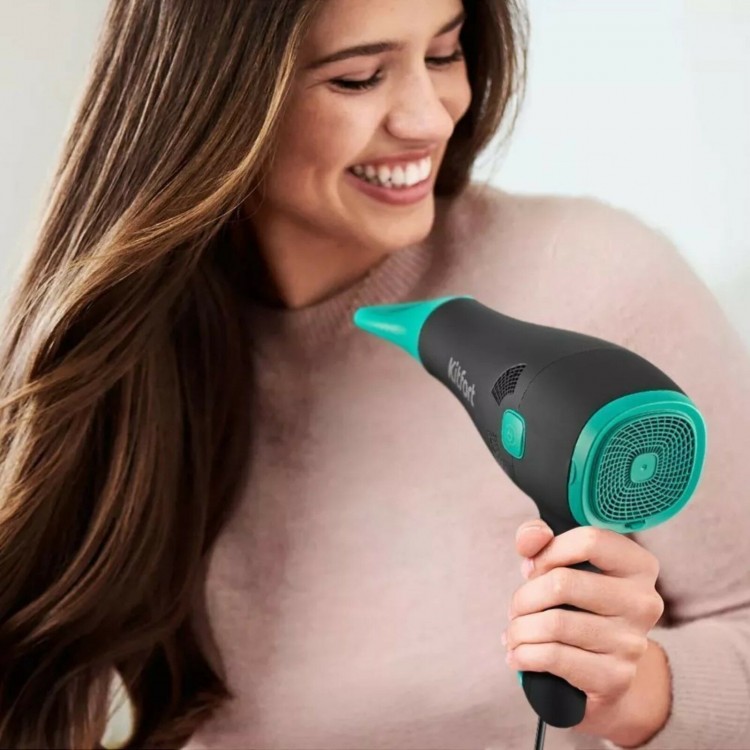 Приобрела данный фен и не ошиблась. Сушит очень быстро, не пересушивая волосы. Очень удобно лежит в руке: не тяжелый, кисть не устает. Очень удобно то, что в модели предусмотрен сматывающийся шнур. По началу я была не уверена в том, что сочетание черного и бирюзового цвета будет хорошо смотреться, но ошиблась: в живую цвет выглядит намного выигрышней, чем на фото. Рекомендую к покупке.