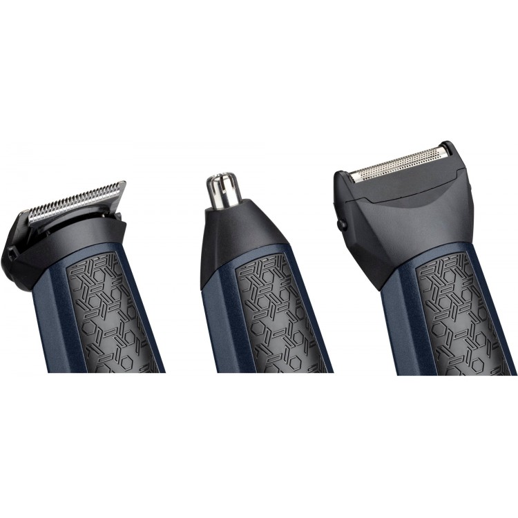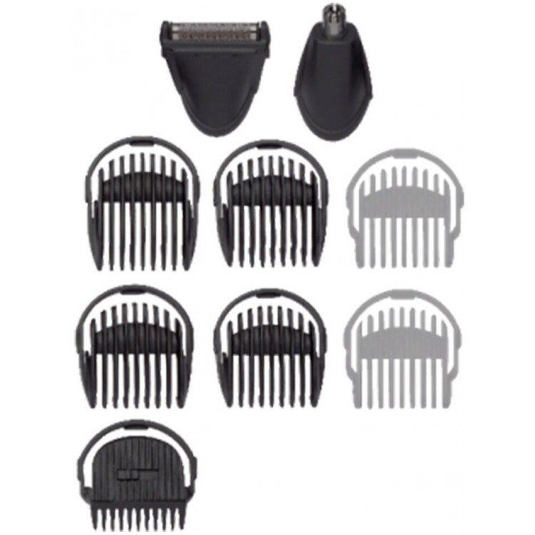 В комплект входят насадки для стрижки бороды и усов (1-3,5 мм, 3-4 мм, 5-8 мм), а также насадка для стрижки волос в носу и ушах. Кроме того, в комплект входит бритвенная насадка и детайлер для бровей.