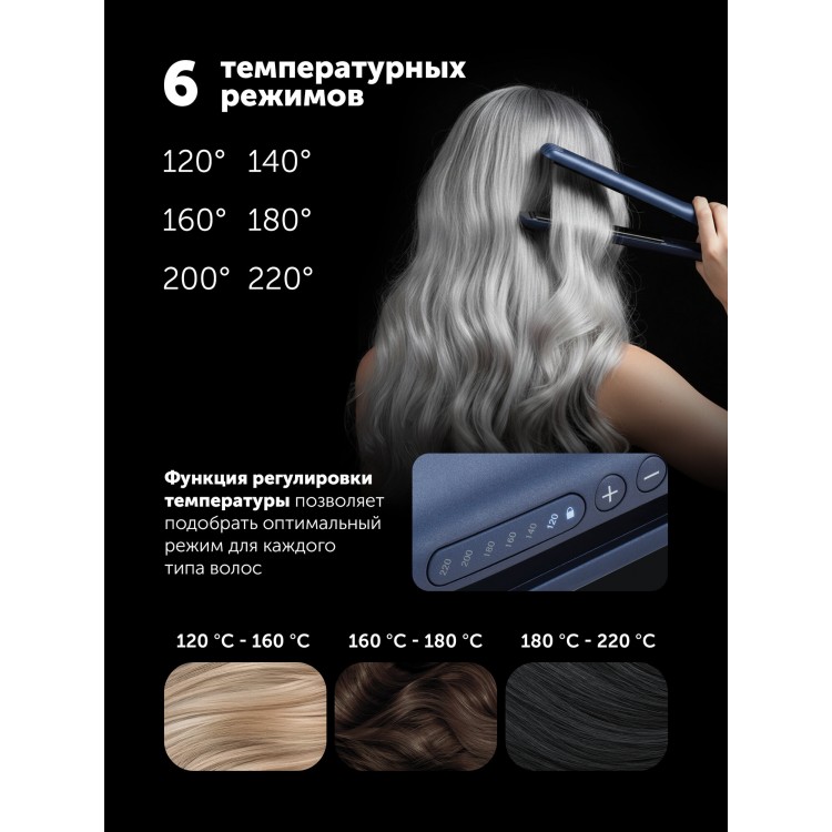 Защита от перегрева, автоотключение, 6 режимов температуры нагрева. Подходят для выпрямления и завивки