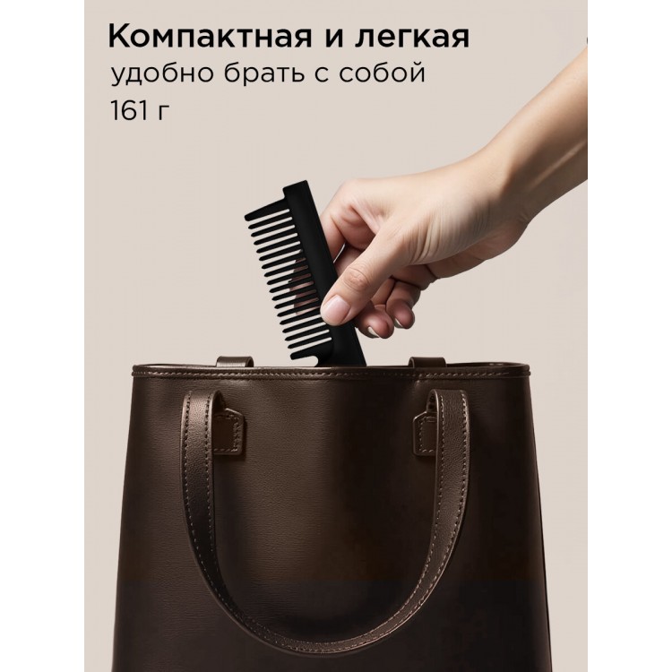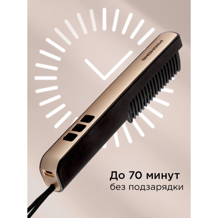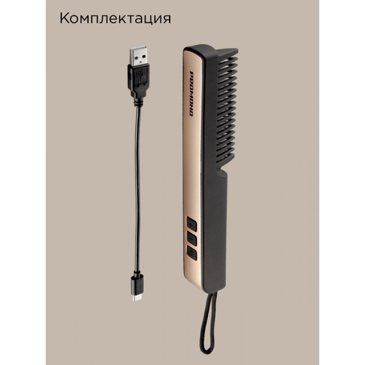 Особенность модели — работа от аккумулятора, что делает её удобной в использовании вне дома. В комплекте с расчёской-выпрямителем вы получите гарантийный талон, кабель USB-C и руководство по эксплуатации.