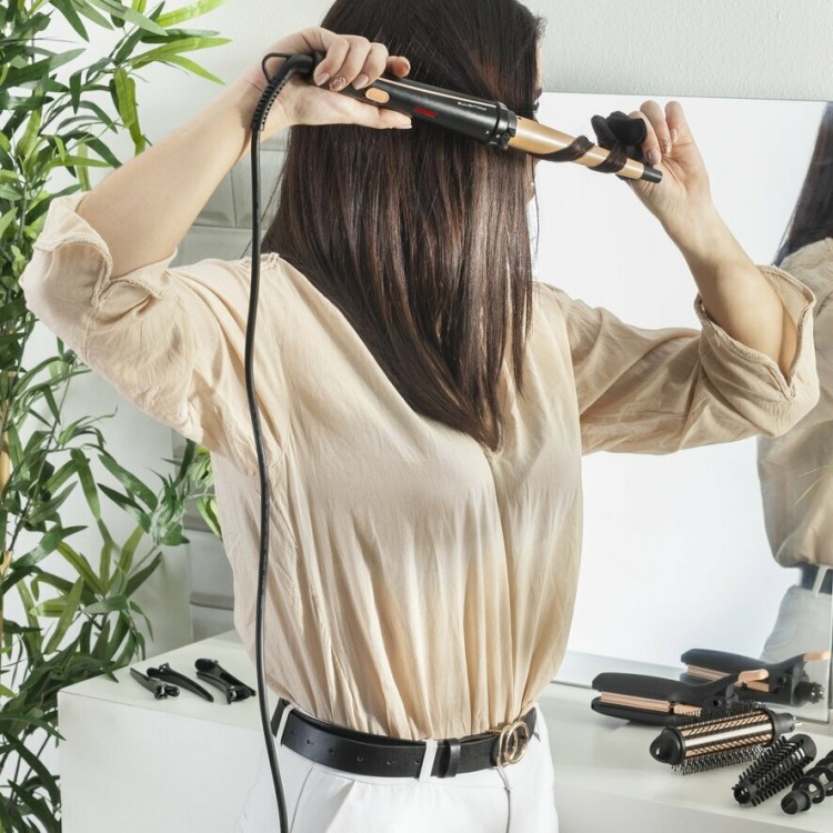 - Количество насадок: 5, включая щипцы для завивки, насадку для локонов, насадку для выпрямления, круглую щётку и конические щипцы.
