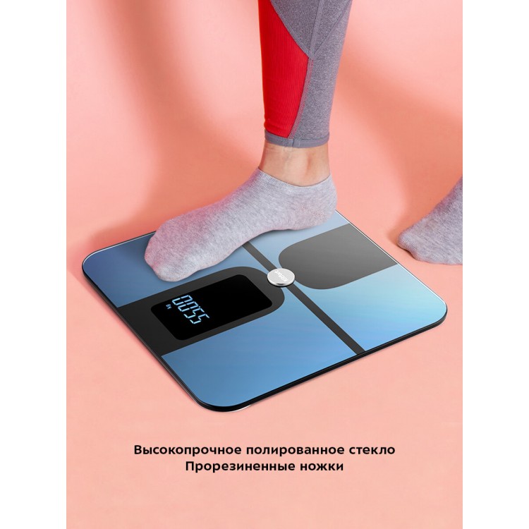 Ещё несколько моментов: • Глянцевая стеклянная платформа сильно маркая, хорошо видны отпечатки, особенно босыми ногами. • Если ноги влажные — может быть скользко. • Анализ состава тела — ориентировочный, как и у всех биоимпедансных весов. Показания зависят от времени суток, позы, уровня жидкости в организме. Но тренды и динамику отображают корректно.
