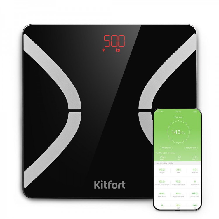 - Точные измерения. Весы Kitfort КТ-837 позволяют определить долю воды, жировой, костной и мышечной ткани в вашем организме, а также рассчитать индекс массы тела (ИМТ).