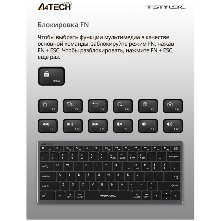 Название Клавиатура беспроводная A4Tech Fstyler FBX51C, серый; Бренд A4Tech; Раскладка клавиатуры английская; Назначение для настольного компьютера, для ноутбука, для дома, офисная, универсальная; Интерфейс подключения Bluetooth; Радиус действия беспроводной связи 10 м; Материал пластик; Доп. клавиши и цифровой блок клавиша Fn, Клавиши управления мультимедиа; Конструкция классическая; Тип клавиатуры мембранная, механическая, ножничная, QWERTY/ЙЦУКЕН, Клавиатура, Клавиатуры, беспроводная, беспроводное; Подсветка нет, Да; Общее количество клавиш 78; Опции беспроводная клавиатура, влагостойкая, дополнительные клавиши; Источник питания собственный Li-Ion; Вес 305 г; Ширина 285 мм; Высота 25 мм; Глубина 285 мм; Комплектация USB-приемник, документация, кабель USB; Дополнительная информация Встроенный аккумулятор; Гарантийный срок 1 г., актуальный срок гарантии указан в гарантийном талоне производителя, приложенному к товару, и может отличаться в большую или меньшую сторону на момент покупки; Цвет серый;