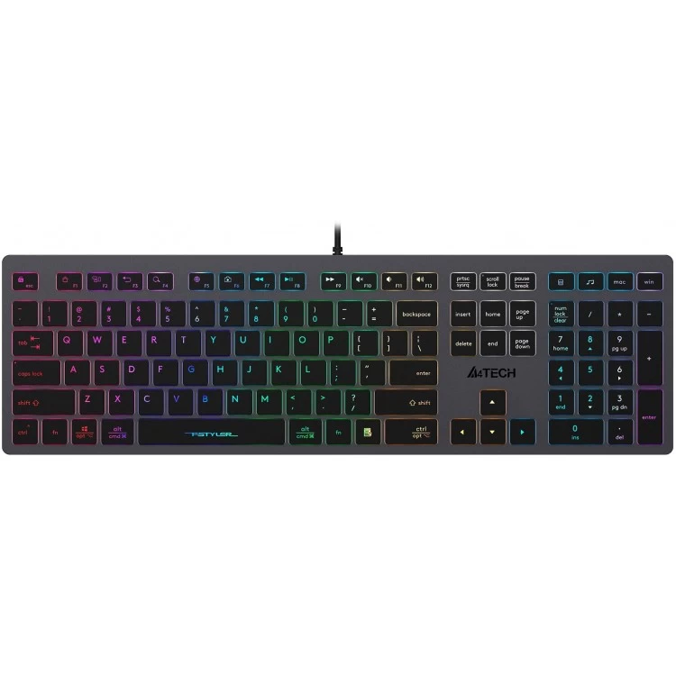 Название Клавиатура A4Tech Fstyler FX60 серый USB slim Multimedia LED FX60 GREY NEON; Бренд A4Tech; Раскладка клавиатуры русская/английская; Назначение для настольного компьютера, для ноутбука; Интерфейс подключения USB; Доп. клавиши и цифровой блок цифровой блок; Тип клавиатуры ножничная; Подсветка подсветка клавиш, RGB; Общее количество клавиш 109; Длина кабеля 1.5 м; Гарантийный срок 1 г; Цвет серый/белый;