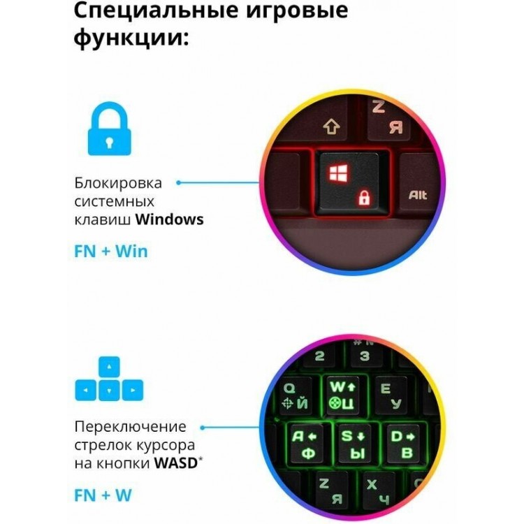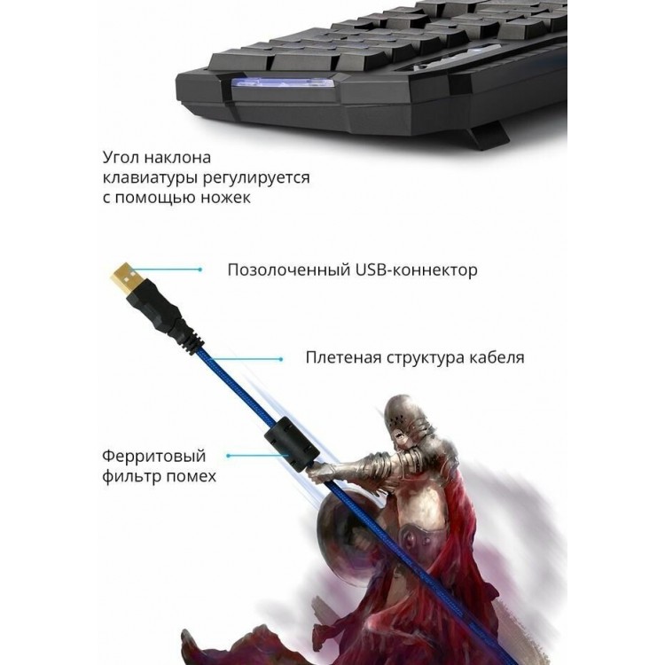 Дополнительная информация | кабель в защитной оплетке, блокировка клавиши Windows, регулировка яркости подсветки, анти-фантомное нажатие до 19 клавиш одновременно, регулировка высоты клавиатуры, позолоченный USB-разъем |