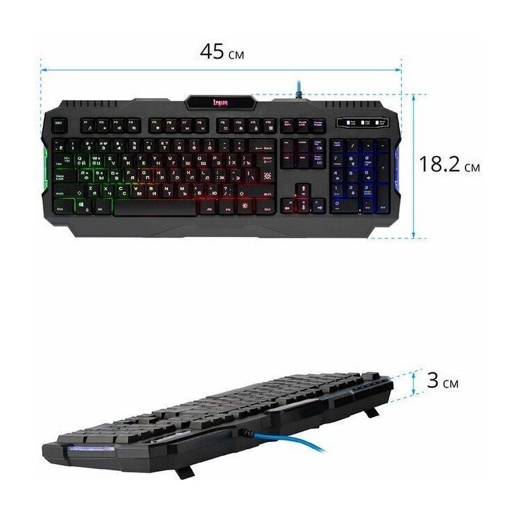 Название Игровая клавиатура Defender Legion GK-010DL RU Black USB; Бренд Defender; Раскладка клавиатуры русская; Назначение игровая; Интерфейс подключения USB; Материал металл, пластик; Доп. клавиши и цифровой блок клавиша Fn, цифровой блок, 12 дополнительных кнопок; Конструкция классическая; Тип клавиатуры мембранная; Подсветка подсветка клавиш, Да, Есть, да; Общее количество клавиш 104; Количество дополнительных клавиш 12; Пылевлагозащита водозащита; Длина кабеля 1.5 м; Вес 780 г; Ширина 448 мм; Высота 36 мм; Глубина 184 мм; Комплектация Клавиатура; Дополнительная информация кабель в защитной оплетке, блокировка клавиши Windows, регулировка яркости подсветки, анти-фантомное нажатие до 19 клавиш одновременно, регулировка высоты клавиатуры, позолоченный USB-разъем; Гарантийный срок 1 г., актуальный срок гарантии указан в гарантийном талоне производителя, приложенному к товару, и может отличаться в большую или меньшую сторону на момент покупки; Цвет черный;