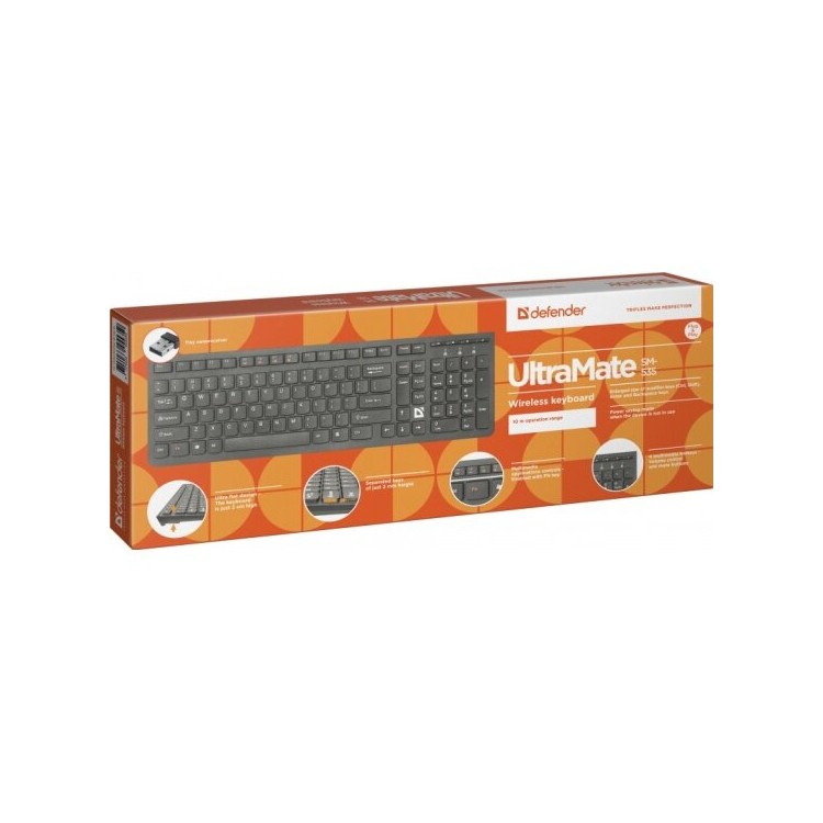 Название Клавиатура Defender UltraMate SM-535 RU (45535 ); Цвет товара Черный; Бренд Defender; Раскладка клавиатуры Русская/английская; Интерфейс подключения USB; Количество дополнительных клавиш 4; Источник питания 2xAAA; Гарантийный срок 1 г; Цвет черный;