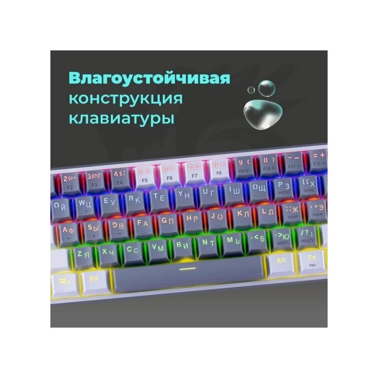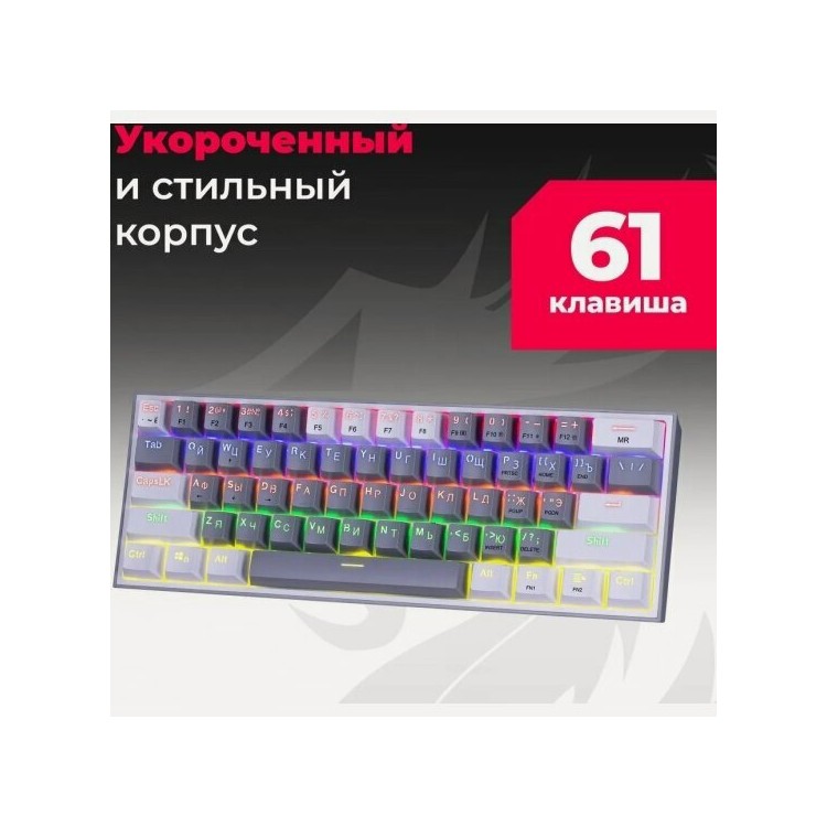 Название Клавиатура REDRAGON Fizz, Rainbow, 72602 белый + серый; Бренд Redragon; Тип механических переключателей Redragon+Melt-Gold; Тип клавиатуры механическая; Подсветка подсветка клавиш; Общее количество клавиш 61; Длина кабеля 1.8 м; Вес 410 г; Гарантийный срок 2 лет; Цвет серый;
