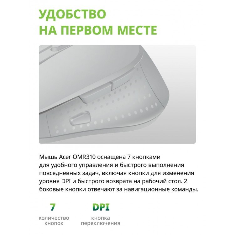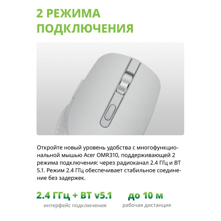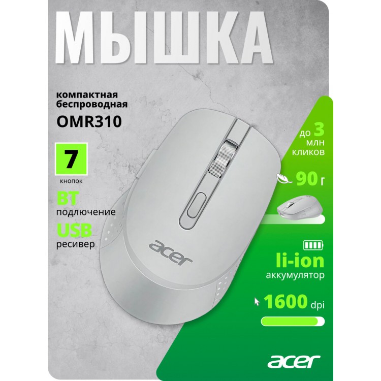 Бренд ACER; Модель OMR310; Технология оптическая; Тип соединения мыши беспроводная; Разрешение сенсора, макс. 1600; Интерфейс подключения USB; Тип Мышь; Тип беспроводного соединения мыши Bluetooth/Радио; Цвет оформления светло-серый; Колесо прокрутки ДА; Дизайн для правой руки; PartNumber/Артикул Производителя ZL.MCECC.033; Габариты упаковки (ед) ДхШхВ 0.195x0.12x0.07; Вес упаковки (ед) 0.135; Объем упаковки (ед) 0.001638; Подключение по USB ДА; Радиус действия мыши 10; Поддержка разрешений 800/1200/1600; Изменение чувствительности сенсора кнопкой ДА; Количество кнопок 7; MTBF, кликов 3000000; Специальное покрытие корпуса soft touch; Возможность работы на покрытиях на любой поверхности; Форм-фактор приемника миниатюрный; Разъем для кабеля на корпусе USB Type C; Длина мыши 103; Ширина мыши 66; Высота мыши 36; Размеры мыши 66x103x36мм; Вес (мыши) 90; Страна производства Китай; Совместимость с ОС Windows; Питание от Li-Ion аккумулятор; Комплектация Беспроводная мышь USB-ресивер Кабель USB Type-C для зарядки Краткое руководство пользователя; Цвет светло-серый;