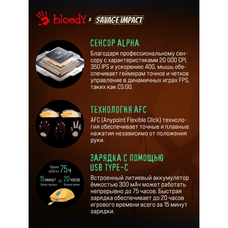 НазваниеМышь A4Tech Bloody R72 Ultra желтый оптическая (20000dpi) беспров. USB-C (6but)