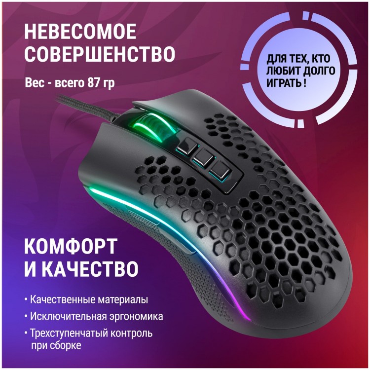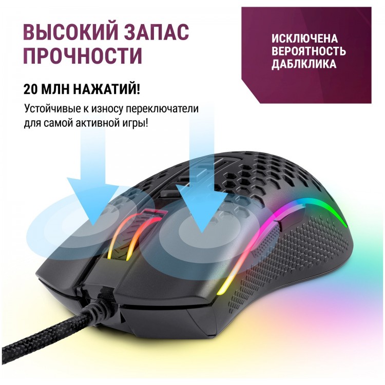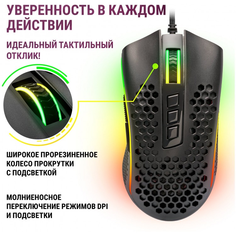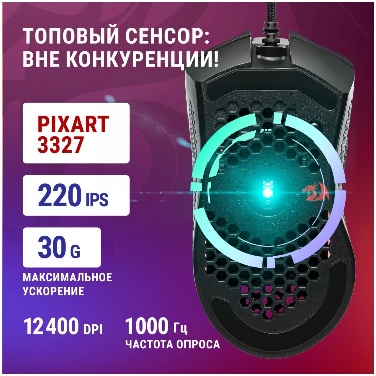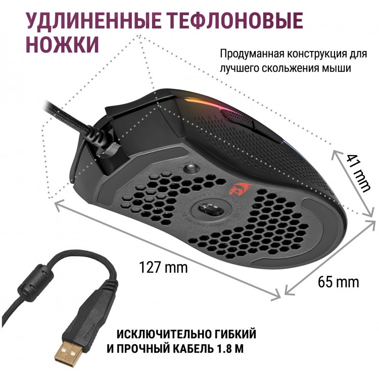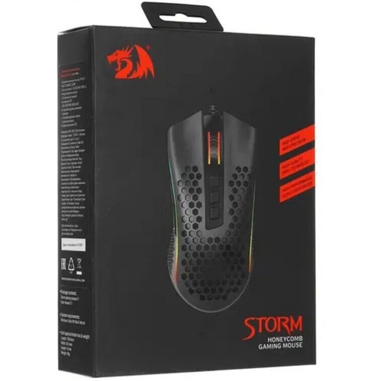 Название Игровая мышь компьютерная Redragon Storm 8 кнопок 12400 dpi; Бренд Redragon; Тип игровая мышь; Тип сенсора мыши оптический лазерный; Тип подключения проводной; Интерфейс подключения USB Type A; Модель сенсора Pixart 3327; Скорость движения 220 ips; Кратность ускорения свободного падения 30 g; Частота опроса 1000 Гц; Разрешение оптического сенсора 12400 dpi; Длина 127 мм; Ширина 65.5 мм; Высота 41 мм; Вес 90 г; Вес (минимальный) 90 г; Дизайн для правой руки; Встроенные опции колесо прокрутки; Особенности подсветка; Длина провода 1.8 м; Количество клавиш 8; Пыле/влагозащита Гибкий тканевый кабель; Комплектация Мышь, упаковка, инструкция, гарантийный талон; Дополнительная информация количество нажатий 20 миллионов; совместимость - Windows 2000/XP/Vista/7/8/10, Mac OS X10; скорость IPS - 220 дюйм/с; переключатели - Huano; Гарантийный срок 1 г; Цвет черный;
