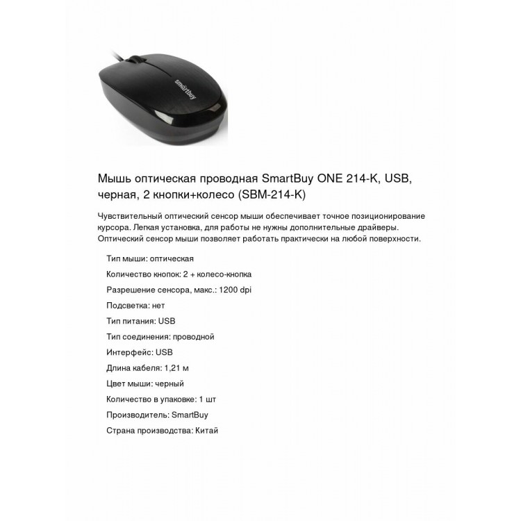 | Название | Мышь оптическая проводная SmartBuy ONE 214-K, USB, черная, 2 кнопки+колесо (SBM-214-K) |