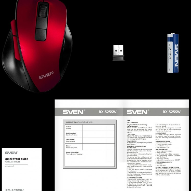 | Название | Sven Беспроводная мышь RX-525SW красная бесшумн. кл, 5+1кл. 600-1400DPI, Soft-touch, блист. |