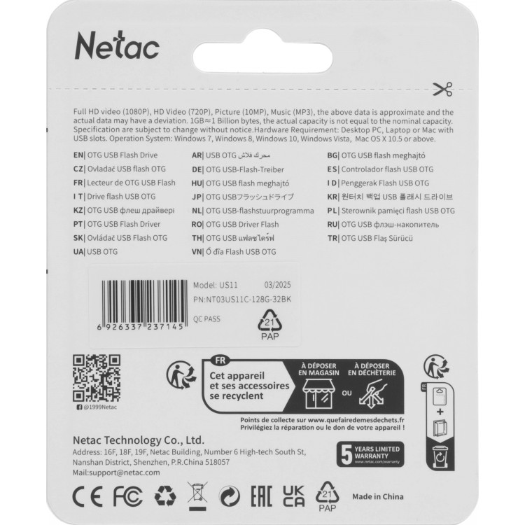 Флешка Netac US11 USB 3.2 Gen +TypeC 128GB (NT03US11C-128G-32BK) (серебристый)
