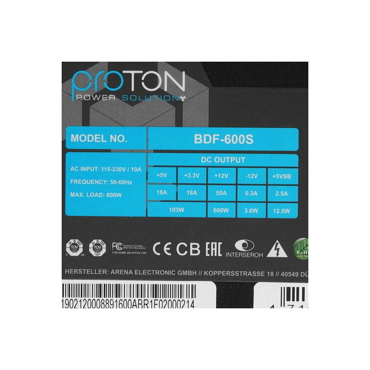 Название Блок питания Chieftec BDF-600S 600W; Бренд Chieftec; Цвет товара черный; Серверные БП Нет; Мощность 600 Вт; Версия ATX12V 2.3; Версия TFX12V Нет; Форм-фактор ATX; PFC активный; Система охлаждения 1 вентилятор; Диаметр вентилятора 120 мм; Тип разъема для материнской платы 24 pin; Количество разъемов 4+4 pin CPU 1; Количество разъемов 6+2-pin PCI-E 2; Количество разъемов 15-pin SATA 6; Количество разъемов 4-pin Molex 2; Стандарт эффективности 80 PLUS Bronze; Цвет подсветки нет; Функции защиты защита от короткого замыкания, защита от перегрева, защита от перегрузки, защита от перенапряжения, OCP (защита от перегрузки по току), OPP (защита от перегрузки), OVP (защита от подачи повышенного напряжения), SCP (защита от короткого замыкания), SIP (защита от импульсных помех), UVP (защита от подачи пониженного напряжения); Ширина 150 мм; Высота 87 мм; Глубина 140 мм; Вес 1.6 кг; Минимальное входное напряжение 115 В; Максимальное входное напряжение 230 В; Ток по линии +3.3 В 18 А; Ток по линии +5 В 18 А; Ток по линии +12 В 1 50 А; Ток по линии -12 В 0.3 А; Ток по линии +5 В Standby 2.5 А; Срок службы 1 г; Гарантийный срок 1 г., актуальный срок гарантии указан в гарантийном талоне производителя, приложенному к товару, и может отличаться в большую или меньшую сторону на момент покупки; Оплетка проводов Защитная; Подсветка Отсутствует; Разъем питания процессора 4 pin + 4 pin; Тип Блок питания компьютера; Цвет черный;
