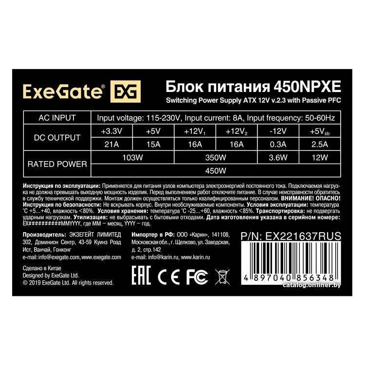 | Название | ExeGate EX221637RUS-PC Блок питания 450W 450NPXE (ATX, PPFC, PC, 12cm fan, 24pin, (4+4)pin, PCI-E, 3xSATA, 3xIDE, black, кабель 220V в комплекте 1,8м) |