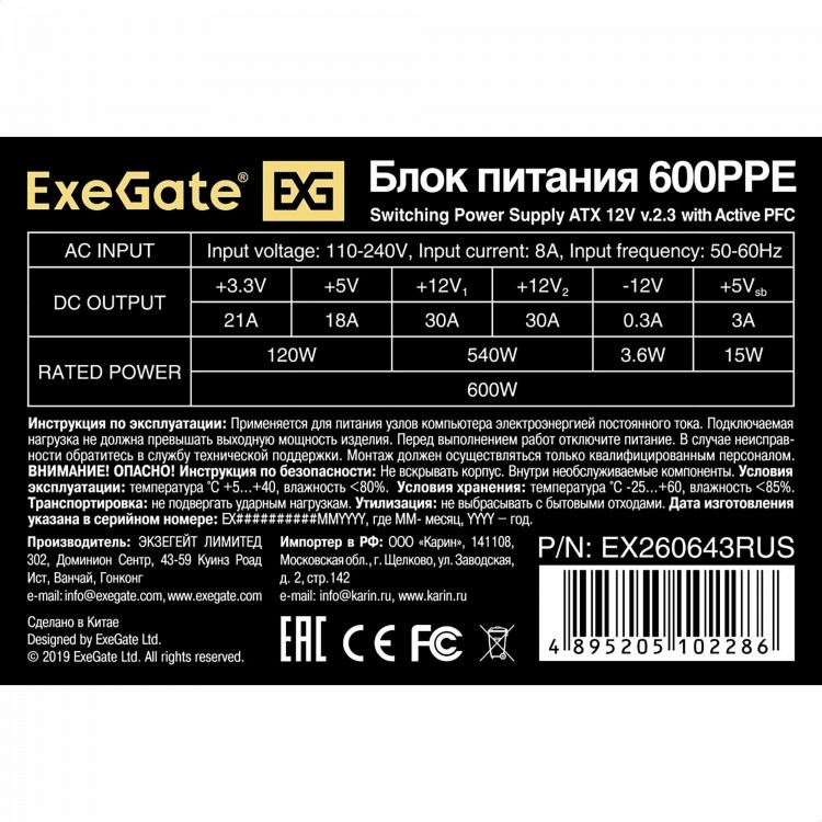 | Название | Блок питания 600PPE (EX260643RUS), 600Вт, 120мм, черный |