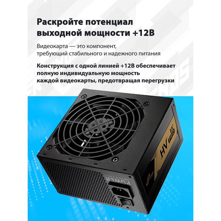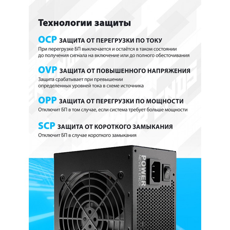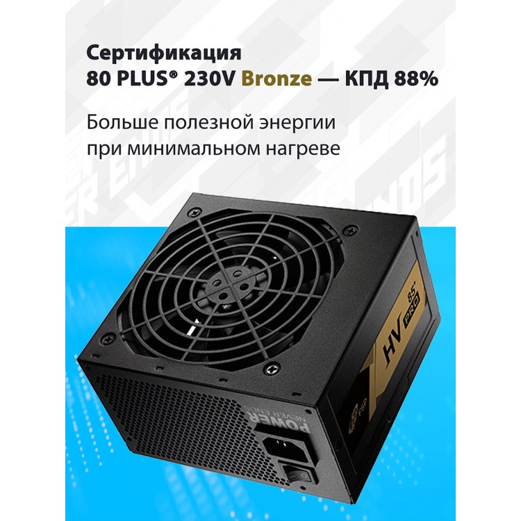Стандарт эффективности 80 PLUS Bronze гарантирует высокое качество и энергоэффективность. Блок питания защищён от короткого замыкания, перегрузки и перенапряжения, что обеспечивает безопасность вашей системы.