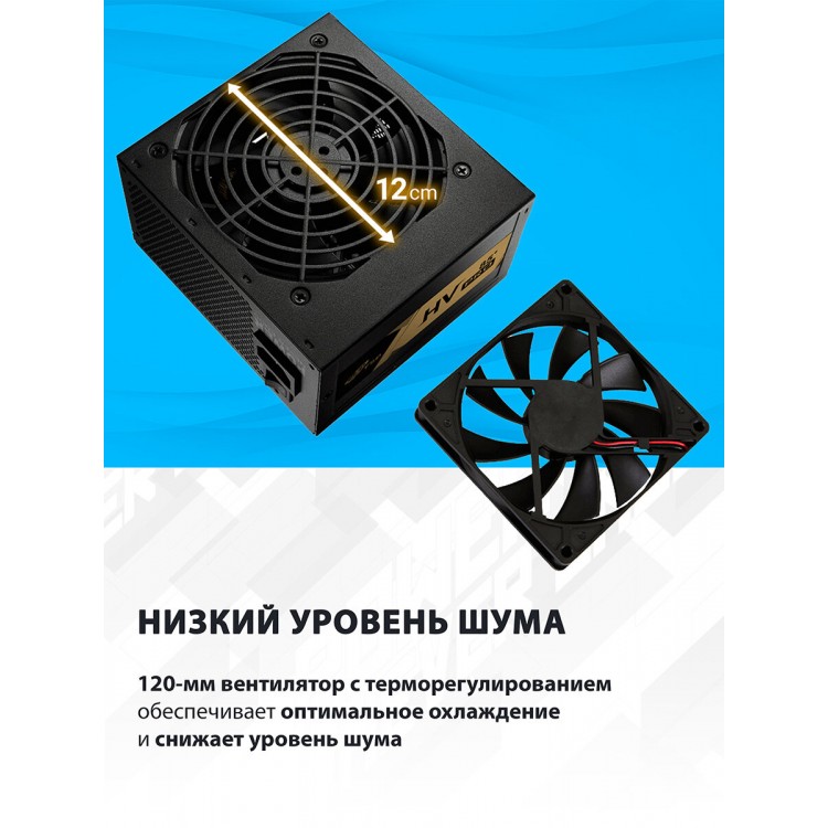 Благодаря активному PFC и активной системе охлаждения с вентилятором диаметром 120 мм, блок питания работает эффективно и тихо. Тип разъёма для материнской платы — 24 pin, что гарантирует совместимость с большинством современных материнских плат.