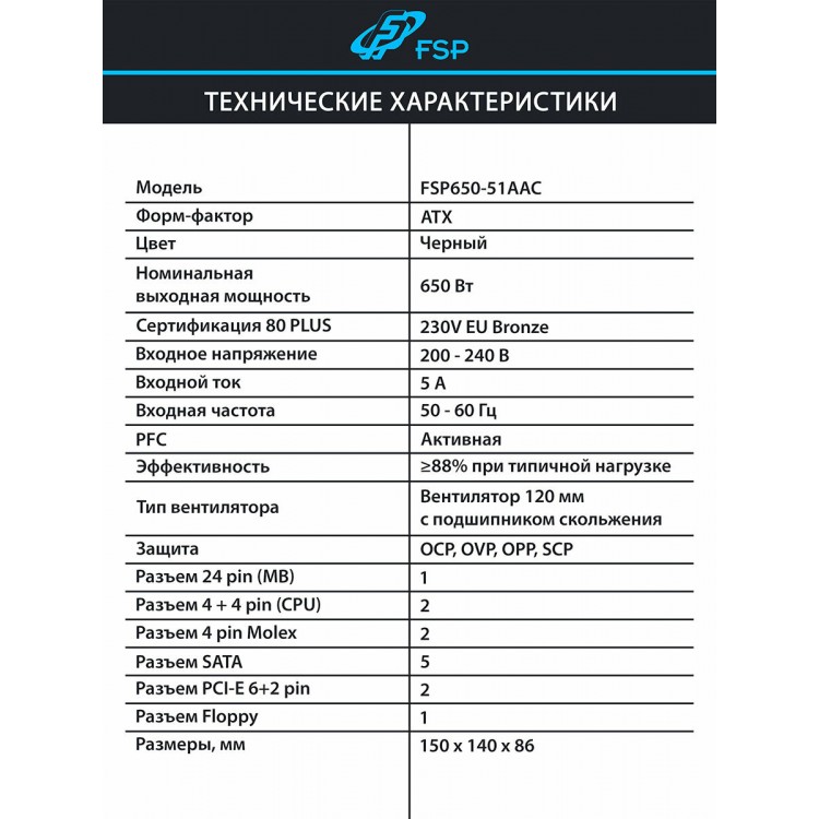 | Дополнительная информация | Комплектация: Блок питания FSP HV PRO 650W 80 Plus; Руководство |
