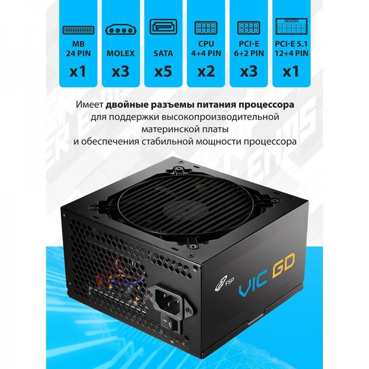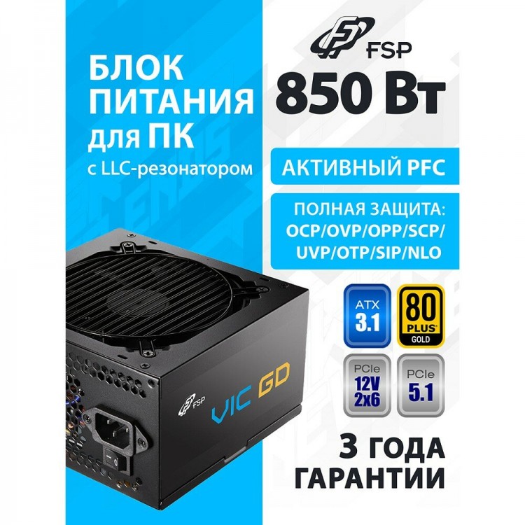 | Название | Блок питания для ПК 850W FSP VIC-850GD 80 Plus GOLD, ATX3.1, поддержка PCIe 5.1, APFC |