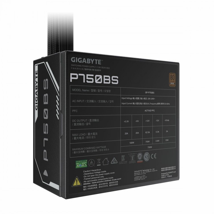Блок питания Gigabyte GP-P750BS имеет 20+4 pin разъёмы для материнской платы, 6+2-pin PCI-E разъёмы (4 штуки) и 15-pin SATA разъёмы (7 штук). Стандарт эффективности — Bronze.
