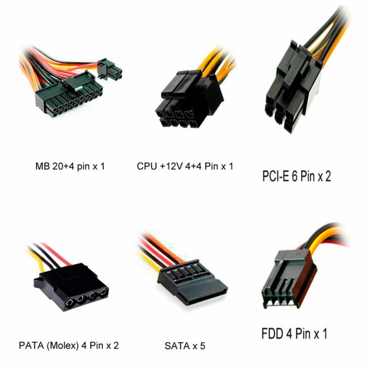 В блоке питания PowerMan 500W PM-500ATX-F предусмотрены различные разъёмы для подключения компонентов компьютера: 20+4 pin для материнской платы, 4-pin и 4+4 pin CPU, 6+2-pin PCI-E, 15-pin SATA, 4-pin Molex и 4-pin Floppy.