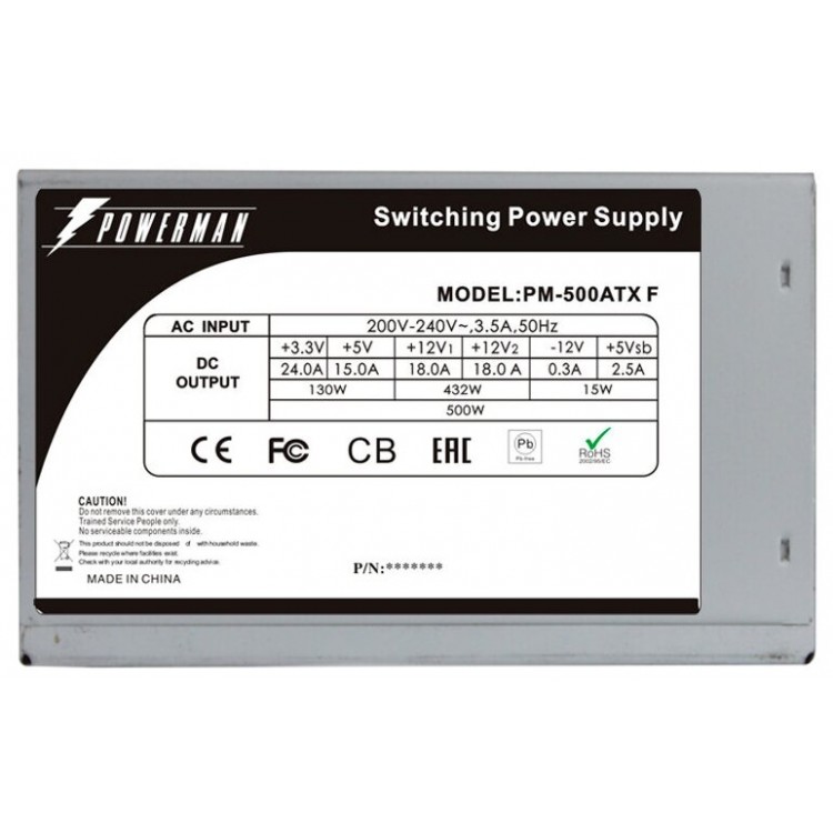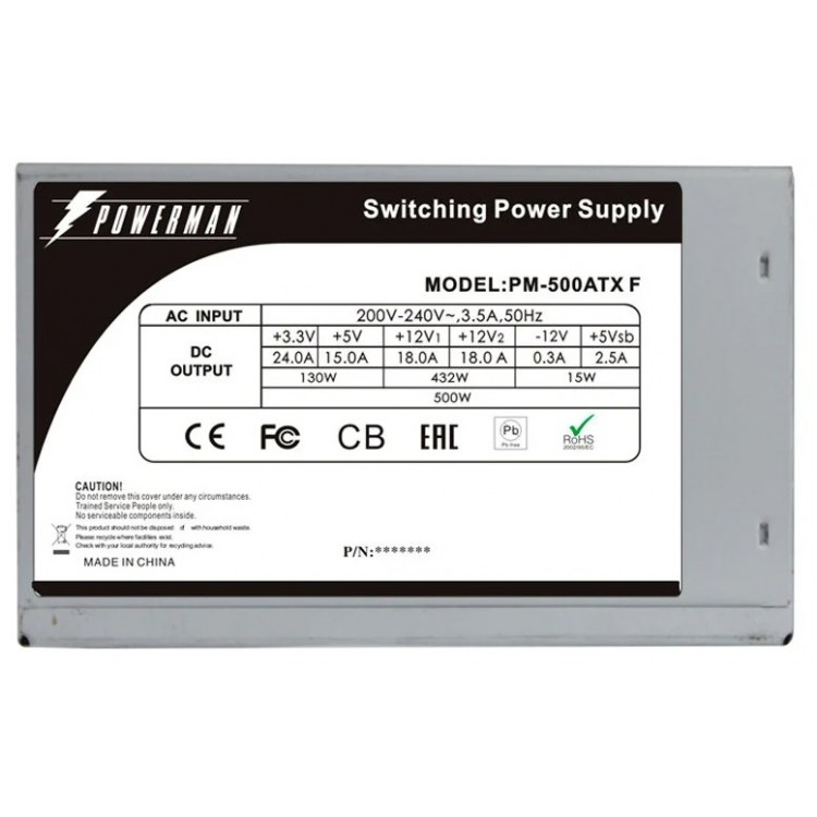 PowerMan 500W PM-500ATX-F оснащён функциями защиты от короткого замыкания, перегрева, перегрузки и перенапряжения. Минимальное входное напряжение составляет 200 В, а максимальное — 240 В.