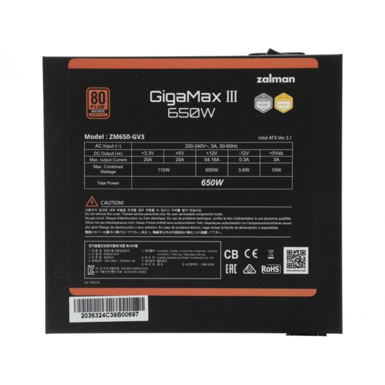 | Название | Блок питания Zalman ZM650-GV3, 650W, ATX12V v3.0, Gen 5.0, APFC, 12cm Fan, 80+ Bronze, Retail (ZM650-GV3) |