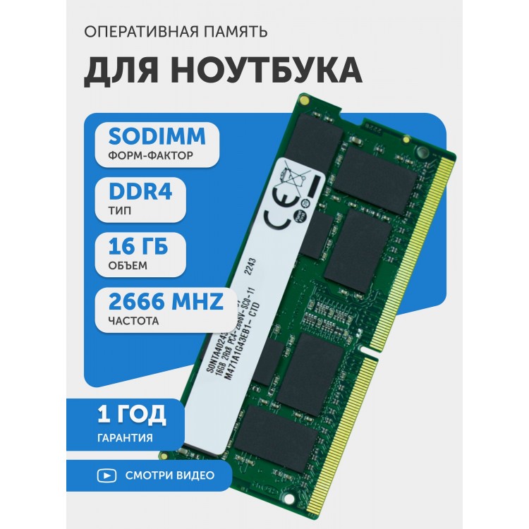 | Название | Модуль памяти Samsung SODIMM M471A1G43EB1-CTD, DDR4, 16ГБ, 2666МГц, PC4-21300, CL19 19-19-19-43 |