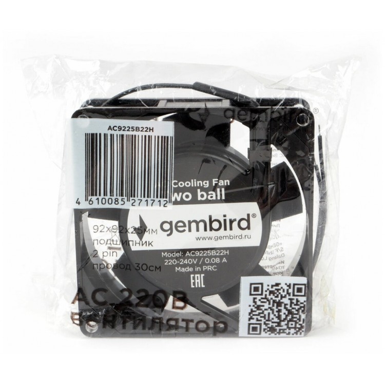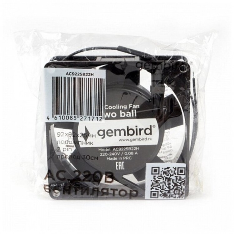 Вентилятор для корпуса Gembird/ 92x92x25/ AC/ 220/ подшипник/ 2 pin/ провод 30 см (18924) (черный)