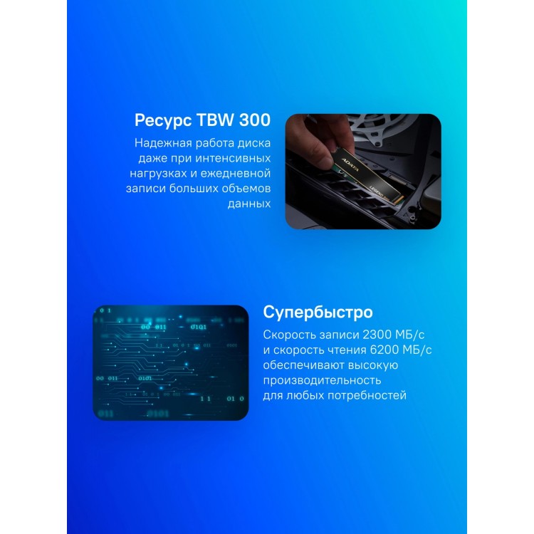* Скорость записи до 2300 МБ/с обеспечивает быструю запись данных, что полезно для установки программ и сохранения файлов большого объёма.