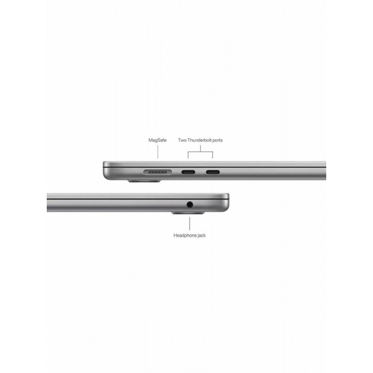 MacBook Air 15 2024 изготовлен из алюминия и металла, что делает его лёгким и прочным. Ноутбук доступен в сером цвете «космос».