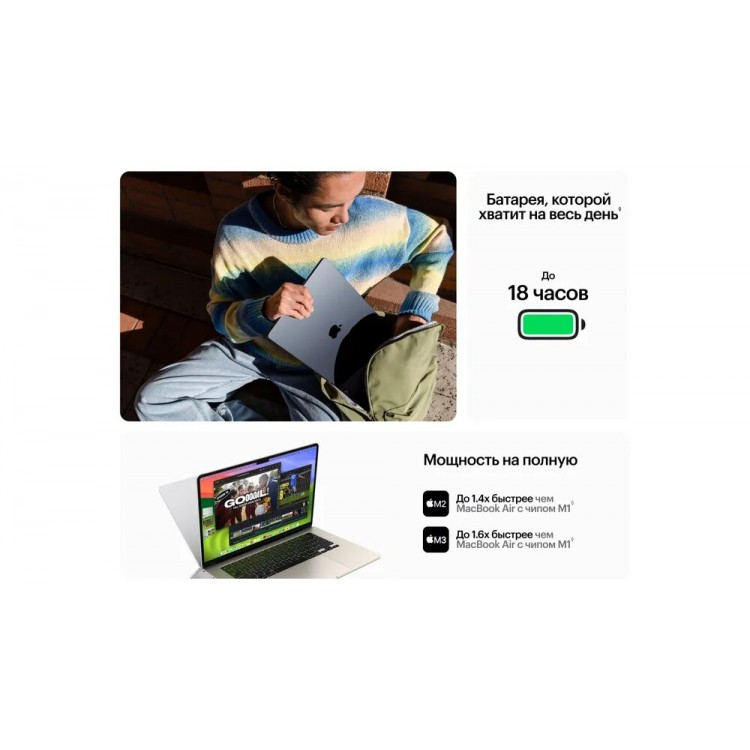MacBook Air 15 2024 — это мощный и стильный ноутбук от ведущего бренда Apple. Он оснащён процессором Apple M3 с 8 ядрами, 16 ГБ оперативной памяти и SSD-накопителем на 512 ГБ (MXD23), что обеспечивает быструю загрузку операционной системы macOS и приложений.