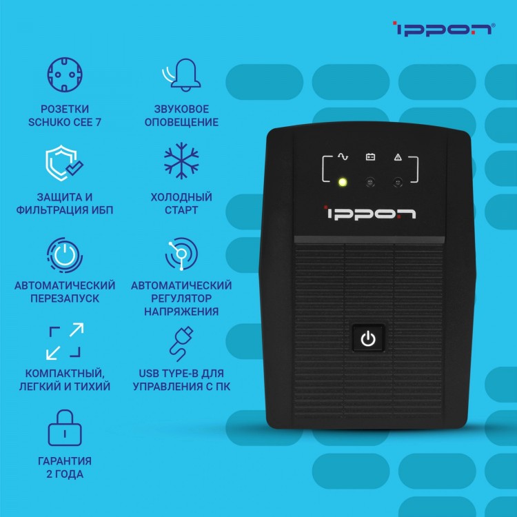 Компактный, заявленную мощность держит, хватает на защиту системного блока и 2 мониторов от внезапных отключений электричества, через кабель можно связать с компьютером для управления питанием ИБП