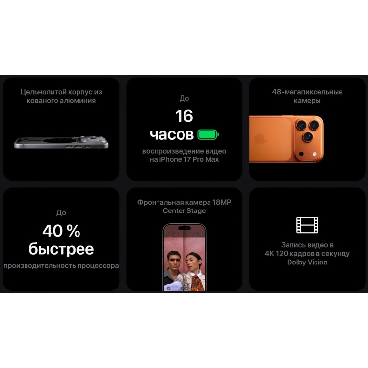 Три основные камеры по 48 Мпикс и фронтальная на 18 Мпикс позволяют делать качественные снимки и видео в высоком разрешении 4K. Apple iPhone 17 Pro Max также обладает гибким и изогнутым экраном, а технология Dynamic Island и Always-On Display добавляют функциональности и удобства.
